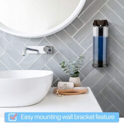 - Attractive and stylish high-quality dark gunmetal and black finish with clear soap container can be wall mounted or placed on a countertop.