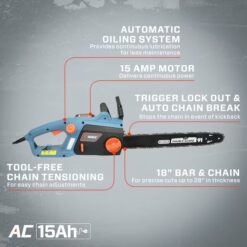 - Powerful Motor: 120V 15 Amp motor delivers the power to cut limbs, branches and trees
