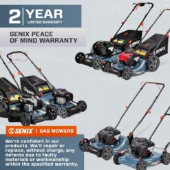 - WHAT’S INCLUDED: This walk-behind lawn mower comes with engine oil, mulch plug, discharge chute, and a 19-gallon bagger; All SENIX gas lawn mowers are backed by our 2-year limited warranty for your peace of mind