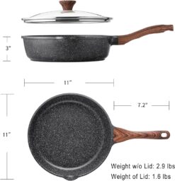 - Glass Lid & Stay-cool Handle – Durable tempered glass lid makes it convenient to see the cooking process and limits splashes on your stove. Woodgrain bakelite handle is comfortable to grip and stays cool while cooking. Oven safe to 302°F.