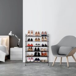 - MULTIPURPOSE 3-TIER RACK – Stores up to 21 pairs of shoes for men, women, and children. Rack holds up to 18 shoes on shelves. Store 3 pairs of low-profile shoes like flats, sandals, and sneakers beneath the rack. 5.5” of space between tiers, 3.5” beneath the rack.