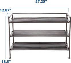 Store and organize with our 3-Tier Stackable Metal Resin Slat Shoe Storage Rack. The metal frame is foldable and features an attractive espresso brown finish. Each shelf features 5 resin slats. The storage rack organizes up to 12 pairs of shoes, with 9 pairs of shoes on the shelves and 3 beneath the unit. Store up to 90 lbs. per rack (30 lbs. per shelf). Stack up to 3 units high for more storage in the same footprint with the included stacking pins. Interlock® – bridge and connect adjacent multiple racks for a personalized modular storage system. Assembly is quick and easy — screw in the leveling feet and clip the shelves onto the frame. No tools required. This multipurpose rack made be used for storage in the kitchen, pantry, closet, living room, bedroom, office, and garage. Patents: US Pat. #8,522,987, 8,651,295, 9,144,332, D626,356, D703,467, D703,468, D724,357, D732,323, and other US and International Patents Pending