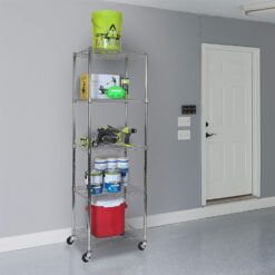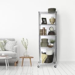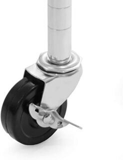 - What’s in the Box? 5 shelves (24″ x 18″), 4 pairs of poles (1″ diameter), 4 wheels (3″ diameter), 4 leveling feet, 20 slip sleeves