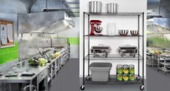 Organize any space with Seville Classics UltraDurable® 4-Tier Commercial-Grade NSF-Certified Steel Wire Shelving System. This heavy-duty shelving is constructed from industrial-strength steel and measures 60” wide by 24” deep by and 76” high fully assembled on wheels (72” high on leveling feet). The 4 shelves and 4 poles are plated steel for protection against corrosion in dry environments. Shelves are adjustable in 1” increments. Includes four 4” heavy-duty rubber wheels and four adjustable leveling feet. NSF Certified – NSF/ANSI Standard 2 – Food Equipment for commercial and restaurant use. This shelving system can store up to 800 lbs. per shelf on leveling feet (3,2000 lbs. total). On wheels this shelving system can store up to 800 lbs. total. No tools are required for assembly.
