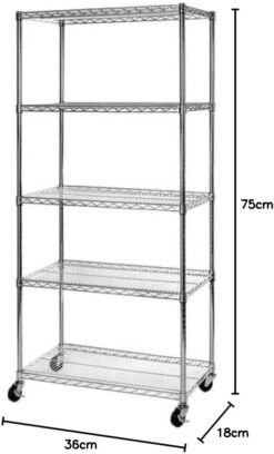 - 5 ADJUSTABLE SHELVES – 36″ x 18″ commercial-grade heavy-duty shelves are height adjustable at 1” increments.