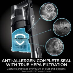 - True HEPA filtration that captures and traps over 99.9% of dust and allergens based on ASTM F1977 down to .3 microns.