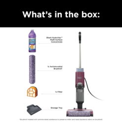 Shark HydroVac™ WD100 vacuums, mops and cleans itself with powerful suction & hydro mopping at the same time. It deep cleans hard floors & cleans area rugs. Includes a self-cleaning, antimicrobial brushroll* to help prevent odors & bacterial growth on the brushroll; 2-tank system to separate clean & dirty water; multi-surface concentrate with odor neutralizer and LED display. *Brushroll treated with antimicrobial substance to preserve roller and resist bacterial odors on the brushroll