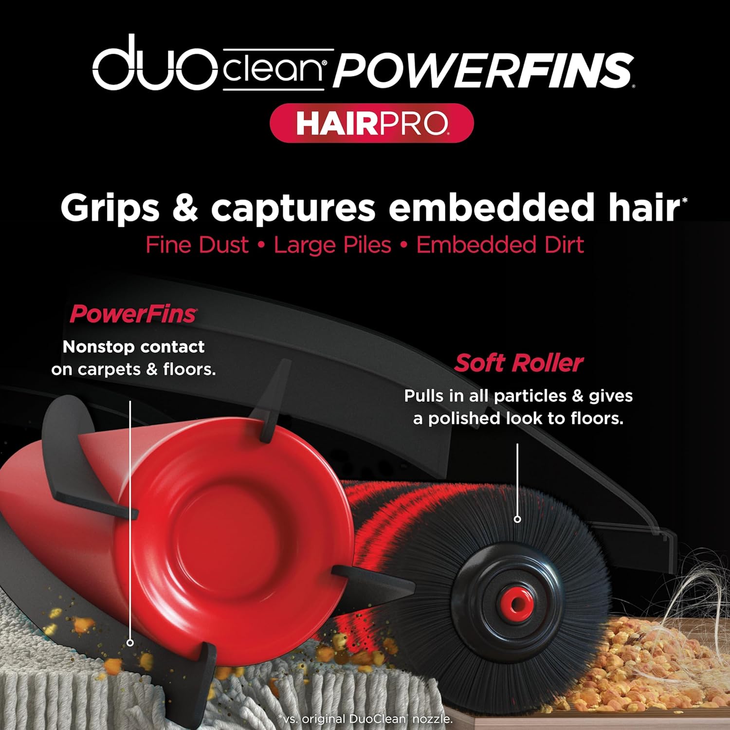 - DUOCLEAN POWERFINS HAIRPRO: A two brushroll system digs deep into carpets, directly engages hard floors, and picks up dirt, debris, and hair in every pass.