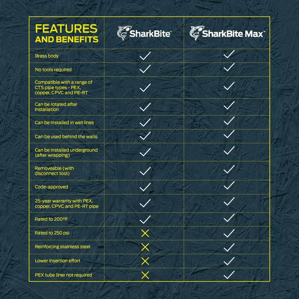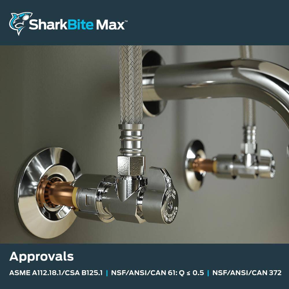 SharkBite Max push-to-connect stop valves are the fastest and easiest way to connect to PEX, copper, CPVC or PE-RT stub-outs, which control and shut off water flow to fixtures or appliances. This newly designed fitting features a stainless-steel collet retainer which delivers additional strength and durability. SharkBite Max fittings and valves don’t require a PEX tube liner and a re-engineered body allows you to insert the pipe using less force and greater ease. The single lever quarter turn handle allows for quick control over water flow, especially in tight spaces. No soldering, clamps, unions, glue or special tools required. After inserting the pipe, stainless steel teeth bite down and grip the pipe tightly while a specially formulated O-ring compresses around the pipe to create a watertight seal. The valve can be rotated after installation for quick adjustments and removing the valve is just as fast with a disconnect tool, allowing them to be changed or reused. (SharkBite push-to-connect fittings are the fastest when compared to other conventual plumbing methods. All other comparisons relate to first generation SharkBite push-to-connect products.).