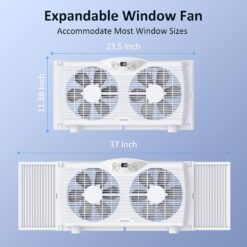 shinic Twin Window Fan with Remote, 9-Inch Blades Reversible Airflow, Thermostat Control, 3 Speeds, 3 Functions, 23.8″-37″ Expandable Width, Window Exchaust Fans for Home Bedroom, ETL Certified