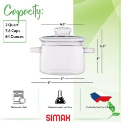 Simax Glass Cookware, 64 Oz (2 Quart) Clear Glass Pot, Glass Saucepan, Potpourri Simmer Pot With Lid, Easy Grip Handles, Made from Oven, Microwave, Stove and Dishwasher Safe Borosilicate Glass