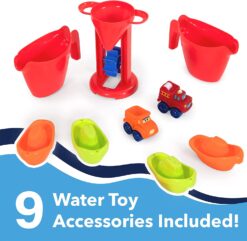 - WATER TABLE TOYS: 9 fun water play accessories including four toy boats, two toy water cars, two water pouring cups and one water splash wheel. Also compatible an umbrella with 7/8″ diameter pole (umbrella not included)