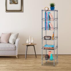 - Narrow wire Shelf :This 6-tiered shelving unit organizer can be used anywhere. The slim storage rack’s 13.4” design can fit an almost any narrow space. Ideal for closets, kitchens, bathrooms, garages, laundry rooms in homes, apartments and even offices