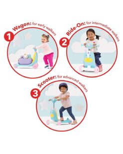 - Stage one, designed for early walkers, motivates little ones to push and pull in wagon mode—a great spot for favorite toys, too. At stage two, the wagon’s storage tub converts to a seat for ride-on mode