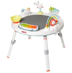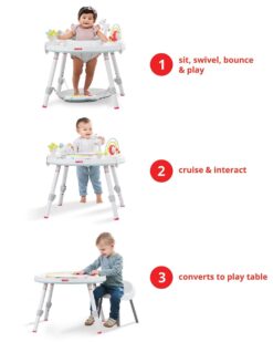 - Three stages of use: Sit, swivel, bounce & play; Cruise & interact; Play table; 25+ developmental activities