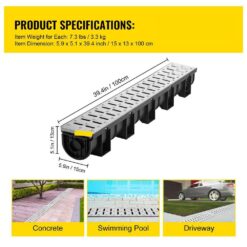 - Low-profile drain system: dimensions of each channel: 5.9 in, w x 5.1in, h x 39,4in, l, commercial water drainage systems allow safe and efficient drainage for grassed areas, gardens, farms, patio areas, pool sides, office buildings, driveways, or factory interiors, the anti-flotation design prevents floating and doesn’t require staking when setting in concrete
