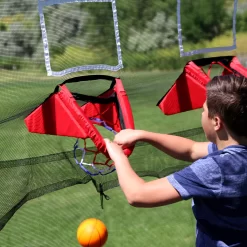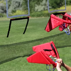 Turn your trampoline into a basketball court with the Skywalker Trampoline’s Double Basketball Hoop for 15’ Trampolines. This accessory will attach to the enclosure poles on your 6-pole, 15’ round Skywalker Trampoline, allowing your kids to show their skills on the court. The hoops can be turned toward the inside of the trampoline to give one jumper multiple targets or turned to the outside of the trampoline, allowing the whole family to take a shot from the grass. The hoops themselves feature a unique hook-and-loop attachment allowing them to break away when sufficient force is applied, keeping kids safe while dunking. This double basketball hoop accessory is sure to provide safe family fun for years to come!