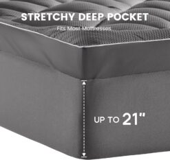- DEEP POCKET & EASY CARE – The knitted skirt pocket stretches up to 21 inches and can fit mattresses 8-15 inches deep. The 1.6-inch-wide sport elastic trim can securely hold your mattress pad in place, and its excellent elasticity makes the pad easy to fit and remove. No shifting, no noises, ensure a restful and uninterrupted sleep. The mattress pad is machine washable. Tumble under a gentle cycle and air dry naturally to make it fluffy again. Please do not bleach, iron, or dry clean.