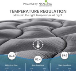 - COOLING BREATHABLE – Mattress pad with new NANOTEX Coolest Comfort Technology features moisture-wicking and fast-drying to actually balance your body temperature throughout the night. The sleep surface is treated with an embossed process, which is usually applied to sports fabrics, making it more breathable and stylish than ordinary material and bringing an advanced dynamic vibe to your bedroom.
