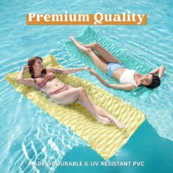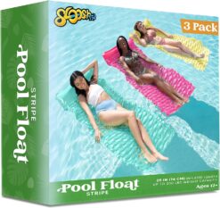 - SUPER VALUE PACK. Our Inflatable Mat Pool includes 3 Swimming pool mats measuring 64”x32” in Yellow, Pink and Blue. Features a comfortable ergonomic headrest that evenly supports your body. A great addition to your relaxing summer days and long summer nights.