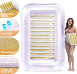 - INCLUDES. Packaged includes one 85” x 57” extra large inflatable suntan pool float featured with Inflatable base for extra comfort, two drink holders, one removable headrest, wrap around rope