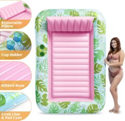 - INCLUDES. Packaged includes one 85” x 57” extra large inflatable suntan pool float featured with Inflatable base for extra comfort, two drink holders, one removable headrest, wrap around rope