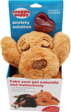 Smart Pet Love Snuggle Puppy Behavioral Aid Dog Toy is designed to help your dog cope with everyday stressors. This comforting toy recreates the intimacy and physical warmth that your nervous pup craves in times of stress due to loneliness, fear and separation anxieties. This stuffed animal behavioral aid also features a real-feel, pulsing heartbeat and heat source that works to calm your pup and reduce negative behaviors such as barking and whining. You can switch the heartbeat function on and off as desired. Added bonus: batteries are included.