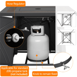 - 11. Please place the hose and valve away from the high-temperature area (e.g. the thermocouple, ignitor, and the bottom of the fire pit). Otherwise, the heat may melt the parts and cause fire or other safety hazards.