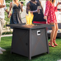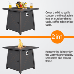 This multi-functional fire pit table is an excellent choice for outdoor heating all year round. Easily light up the sparkling flames with an electronic ignition switch and be surrounded with warmth and coziness in no time. The durable all-steel construction ensures long working life, providing you with many years of functions and pleasure. Practical and versatile as it is, it can not only serve as a fire pit table but be used as a dining table, coffee table or bar table with the lid covered, a perfect combination of summer table and winter pit. Bring a romantic atmosphere to your outdoor space with this stunning square fire table and enjoy quality time with your family and friends at all seasons.