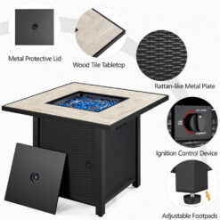 SMILE MART 30″ Propane Gas Fire Pit Table with Ceramic Tabletop Rattan Pattern Steel Base for Garden/Patio/Courtyard, Black