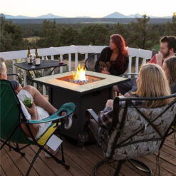 Featuring a modern and elegant ceramic tabletop, this fire pit is complete with a durable steel base and legs, making it an eye-catching centerpiece for your outdoor living space. With the 50,000 BTU stainless steel burner, you are ensured with stable fire without being bothered by smoke and ashes. This piece also comes with blue fire glass to give your more glamorous flame. The flame can be easily turned on and adjusted by pressing and turning the electronic control knob. A pull-out side panel underneath the tabletop provides you with the great convenience of storing a standard 20lb propane tank. Cover the lid and you can use this fire table as a dining table, coffee table or bar table, versatile for multiple scenarios. Whether hosting garden parties or chilling with your family or friends on the terrace, this propane fire pit table will be your best partner against the cold and enjoy food and drinks.