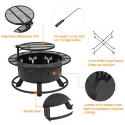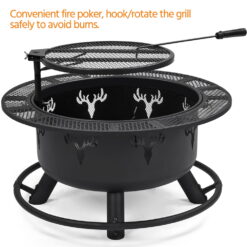 Constructed of heat-resistant painted metal, this wood burning fire pit can withstand 400℃-600℃/752℉-1112℉. It features a flexible cooking grate that can be adjusted horizontally and vertically for your convenience. The deep and spacious fire bowl accommodates more logs and increases ventilation to boot. The decorative deer head cutouts on the fire bowl give a unique and wild look to the fire pit. Quick assembly is needed.
