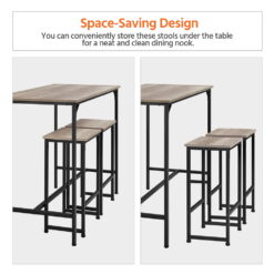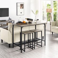 Lacking space to put a big, bulky table in your dining area? This rectangular wooden & metal table set could provide you with a perfect breakfast & bar nook without taking up too much space. Made of premium engineered wood and a sturdy iron frame, this dining set is sturdy and durable for long-term use. The spacious tabletop allows two people to dine, cook, drink, eat breakfast comfortably and there is plenty of room for storing daily necessities. With a backless design, you could sit in any direction and the added footrest brings extra comfort to you. This kitchen table set comes with a strong industrial flavor, while the straight silhouette makes it more contemporary and chicer. This kitchen table set perfectly combines practical use and a stylish look. Each set includes 1 table and 2 stools, which is ideal for the home bar, dining room, kitchen, living room, apartment, studio, and other small spaces. The adjustable feet keep the dining set height balance and protect your floor away from scratches.