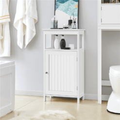 Looking for a practical bathroom cabinet without taking up too much floor space? This 4-tier free-standing cabinet is the pick! Clean-lined design combined with slatted paneling makes this cabinet modern and sleek, making it works well in a variety of aesthetics. P2 MDF and metal hardware, selected materials make sure that the storage rack works well for a long time. The mix of open and concealed storage brings more flexibility to your daily storage. An adjustable shelf is convenient for you to place different-sized items. Included wall mounting hardware and back panel fixtures help to improve stability and safety. You can use it in the bathroom, living room, kitchen, hallway or office as you need.