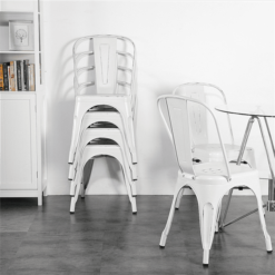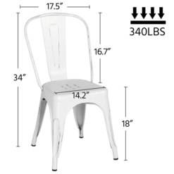 The SmileMart Industrial Modern Metal Dining Chairs come in a set of four allowing you conveniently decorate your space while providing you with good value. These indoor/outdoor dining chairs are applicable for kitchens, bistros, patios, cafes, restaurants and dining rooms. The rubber feet keep the chairs from sliding and scratching hardwood floors. There are several holes on the surface of each chair which are designed to release pressure and provide ventilation when sitting in them. They are industrial and modern allowing them to match many various interior design styles. The chairs are made of iron metal and the max load bearing is 340 pounds. The high-quality material is solid enough for everyday needs and durable enough for long-term use. Because of the glossy surface is polished in water-resistant and rust-resistant material, these chairs will withstand weather changes. Instructions and accessories are included.
