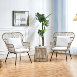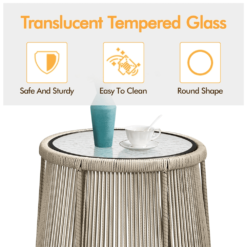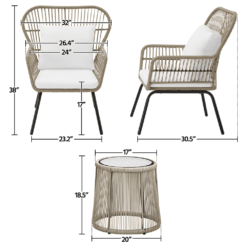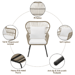 If you’re looking for wicker furniture for your courtyard/garden/patio, you will not be disappointed with this 3-piece wicker bistro set. Stylishness and durability meet in harmony with this outdoor conversation set. Constructed with powder-coated iron and hand-woven PE rattan, this 3-piece bistro set is sturdy and not easy to deform. PE rattan wicker is the highest quality rattan and is incredibly long-lasting. With this outdoor conversation set, you can create a private space in your patio, garden, poolside, yard, lawn, and other outdoor or indoor spaces. It will also be an elegant decor! In addition, with all the required accessories and instructions, it won’t take you much time to set up. Best of all, high-quality material makes this outdoor wicker table set cleaning a breeze for hassle-free maintenance. This patio table set has 2 rattan armchairs and a circle tempered glass table for you and your family or friends to sit together and chat freely with each other.