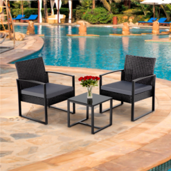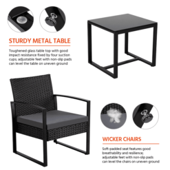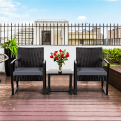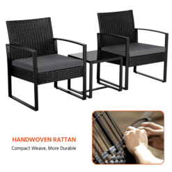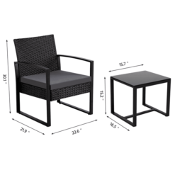 This stylish 3-piece bistro set with tea tables and rattan chairs has steel frames for strength and durability. The table has a sturdy glass top and the rattan chairs are handmade using wicker with powder coating.