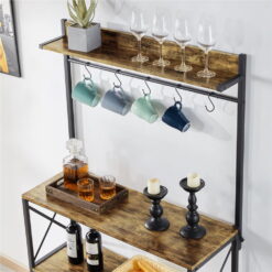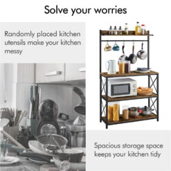 Crafted with a sturdy steel frame, this piece uses superior particleboard tabletop and shelves. The Bakers Rack kitchen Storage Shelf offers four multi-sized shelves to organize your go-to kitchen needs like kitchenware or spice jars and smaller appliances like microwaves and coffee makers. It includes 5 S-Hooks for hanging utensils. The distressed brown color of this kitchen storage shelf can coordinate with a variety of styles, especially rustic barn-style and industrial design. With a rustic-looking and modern industrial style, this kitchen baker’s rack can go well with another kitchen decor. Apart from being a storage rack in your kitchen, it can also be a stylish decoration that might bring a different tone to your home.