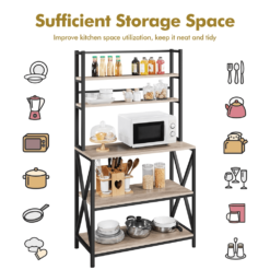 Keep all your kitchen necessities right at hand while effortlessly add a touch of rustic industrial appeal with this 5-tier baker’s rack. Crafted with a powder-coated metal frame in matte black finish, this piece uses CARB P2-Compliant laminated engineered wood tabletop and shelves. This utility storage shelf offers five multi-sized shelves to organize your go-to kitchen needs and smaller appliances like microwaves, coffee makers. The distressed brown color of this kitchen utility storage shelf can coordinate with a variety of styles, especially rustic barn-style and industrial design.