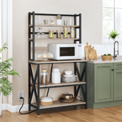 Don’t want to sacrifice style for functions? This 64.5″ H kitchen baker’s rack with outlets is an effortless solution. It brings plenty of kitchen storage with the 5 multi-sized open shelves, while the 2 AC outlets with an overcurrent protection switch and 6.5′ power cord amp up the functionality. The ETL-listed outlets allow 2 kitchen appliances to run at the same time safely. The generous storage space, convenient electrical power system and not to mention chic appearance, this utility shelf serves perfectly as a microwave oven stand in the kitchen or as a coffee bar in the living room or office. Simple assembly is required.