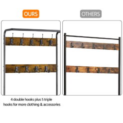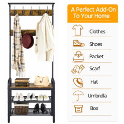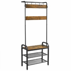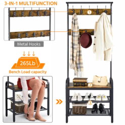 This coat rack is made of high quality and durable materials, guaranteeing to last a long time. This multifunctional entryway hall tree provides vertical storage for small-space living. Offering the perfect place for shoe changing, the bench features 2 racks to neatly hold shoes out of the way. It has 23 ball-end hooks to keep your bags, hats, coats, keys, and dog leashes handy and tidy. The bench is finished in rustic brown and matches wonderfully with the matte black racks. This is a practical addition to any entryway, hall, foyer, mudroom and bedroom.