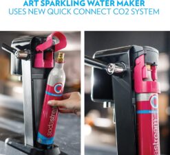 The SodaStream Art Sparkling Water Maker celebrates the art of making your own fresh sparkling beverages at home. With a push of the lever, turn flat water into fresh sparkling water and customize it to your liking. The Art features a retro looking design along with a unique carbonating lever. Manual carbonation, no batteries required. One SodaStream reusable carbonating bottle can save thousands of single use plastic bottles. Always fizz water before adding any flavor.