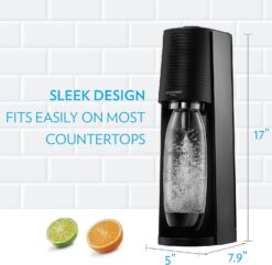 The Terra Sparkling Water Maker turns plain water into fresh sparkling water in seconds at the push of a button and is designed for the modern kitchen. Featuring new Quick Connect technology for fast and easy CO2 cylinder insertion. The improved design features an elegant matte finish, updated slim silhouette, improved ergonomics, a dishwasher safe carbonating bottle and Quick Connect CO2 cylinder technology. Manual carbonation, no batteries required. One SodaStream reusable carbonating bottle can save up to thousands of single use plastic bottles. Always fizz water before adding any flavor.