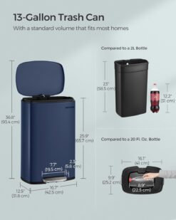 SONGMICS 13 Gallon Trash Can, Stainless Steel Kitchen Garbage Can, Recycling or Waste Bin, Soft Close, Step-On Pedal, Removable Inner Bucket, Midnight Blue ULTB050L01
