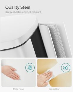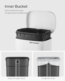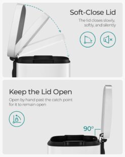 - [Turn an Eyesore into an Eye-Catcher] There’s no reason that a trash can have to look shabby. From the matte white finish to its clean lines, this SONGMICS 8-gallon trash can makes it part of the design in your kitchen, bathroom, or office