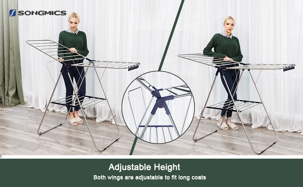 - [Adjustable Wings] The top 2 wings, each with 3 adjustable heights from the floor (39.4″, 44.3″, and 48.4″), allow you to dry clothes of varying lengths. Shirts, trousers, sheets — everything will hang up perfectly on this clothes airer