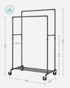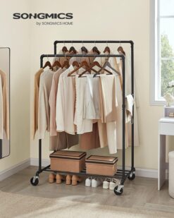 Strong Construction:Â For exceptional built quality, high weight capacity and convenient mobility – look no further than SONGMICS Industrial Pipe Double Rail Garment Rack.