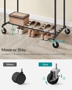 SONGMICS Heavy-Duty Clothes Rack, 39.4 Inch Clothing Rack with Storage Shelf, Double-Rod Garment Rack on Wheels, Metal Frame, 2 Casters with Brakes, Holds up to 198 lb, Black UHSR60B