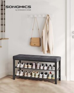 SONGMICS Shoe Bench, 3-Tier Shoe Rack for Entryway, Storage Organizer with Foam Padded Seat, Linen, Metal Frame, for Living Room, Hallway, 12.2 x 39.4 x 19.3 Inches, Dark Gray and Black ULBS579B33