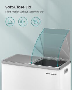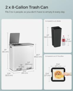 - [What You Get] A dual trash can sized at 23.2”L x 12.8”W x 25.7”H with 2 x 8-gallon compartments, 15 trash bags, plastic inner buckets, and a soft closure mechanism for easy waste disposal